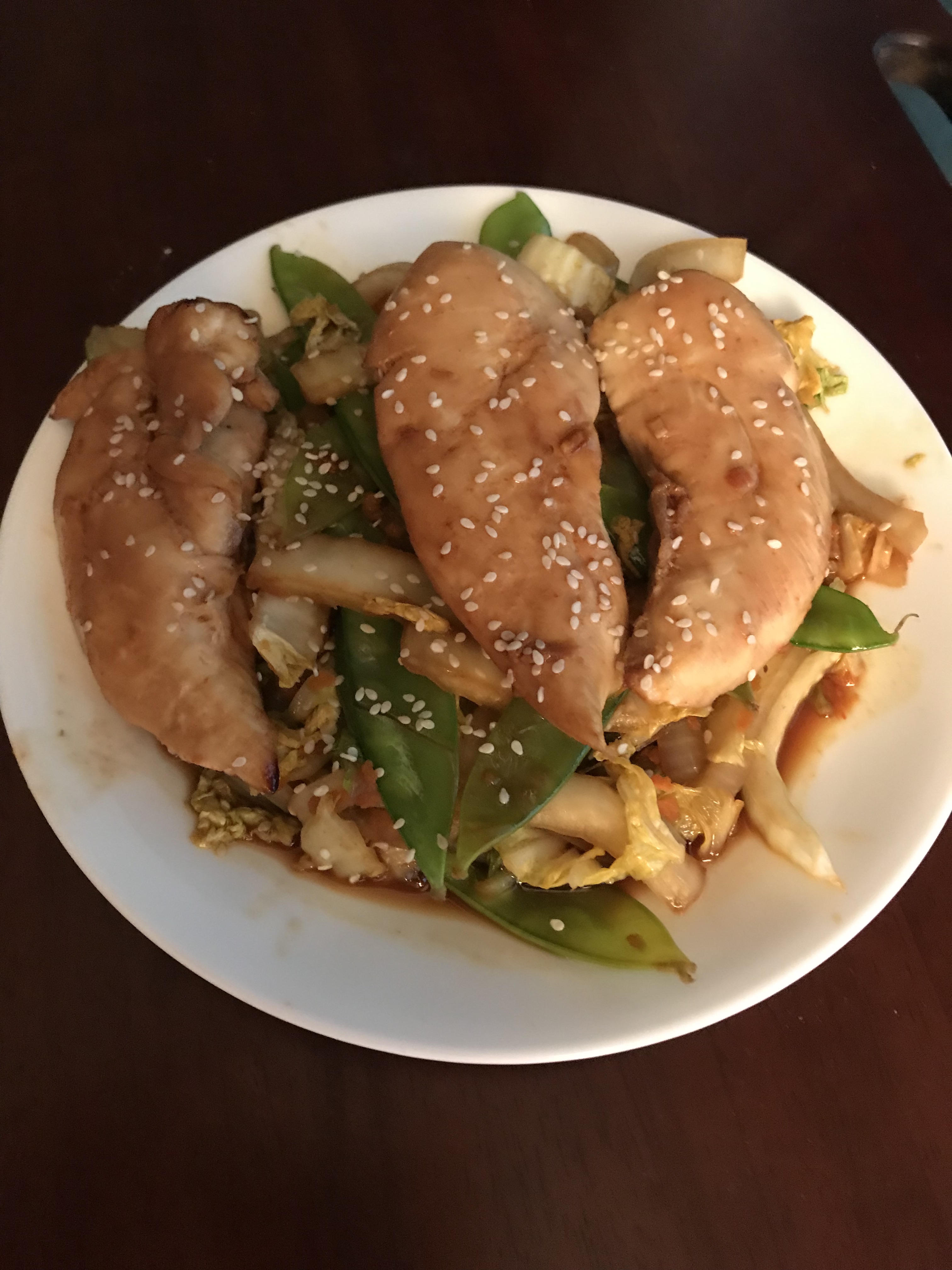 It’s summer so that means we get to fire up the grill and have a cool refreshing salad to start out the week! Pork, in my opinion, is one of the more underrated meats to cook because it’s a change from the typical chicken that most American households cook on a daily basis, while having the texture of red meat without actually being it, for all those heart healthy people out there. Peaches are now in season so I took full advantage of them and paired them with a crisp cucumber to make a simple salad. The dressing to go on top was a honey lime vinaigrette that beautifully married the two flavors together. Then later in the week I cooked an Asian inspired stir fry. The combination of the carrot, snap peas, and cabbage made a great side to the wonderfully flavorful baked chicken. The marinade and sauce was super simple and can be recreated for any other Asian inspired dish you may want.